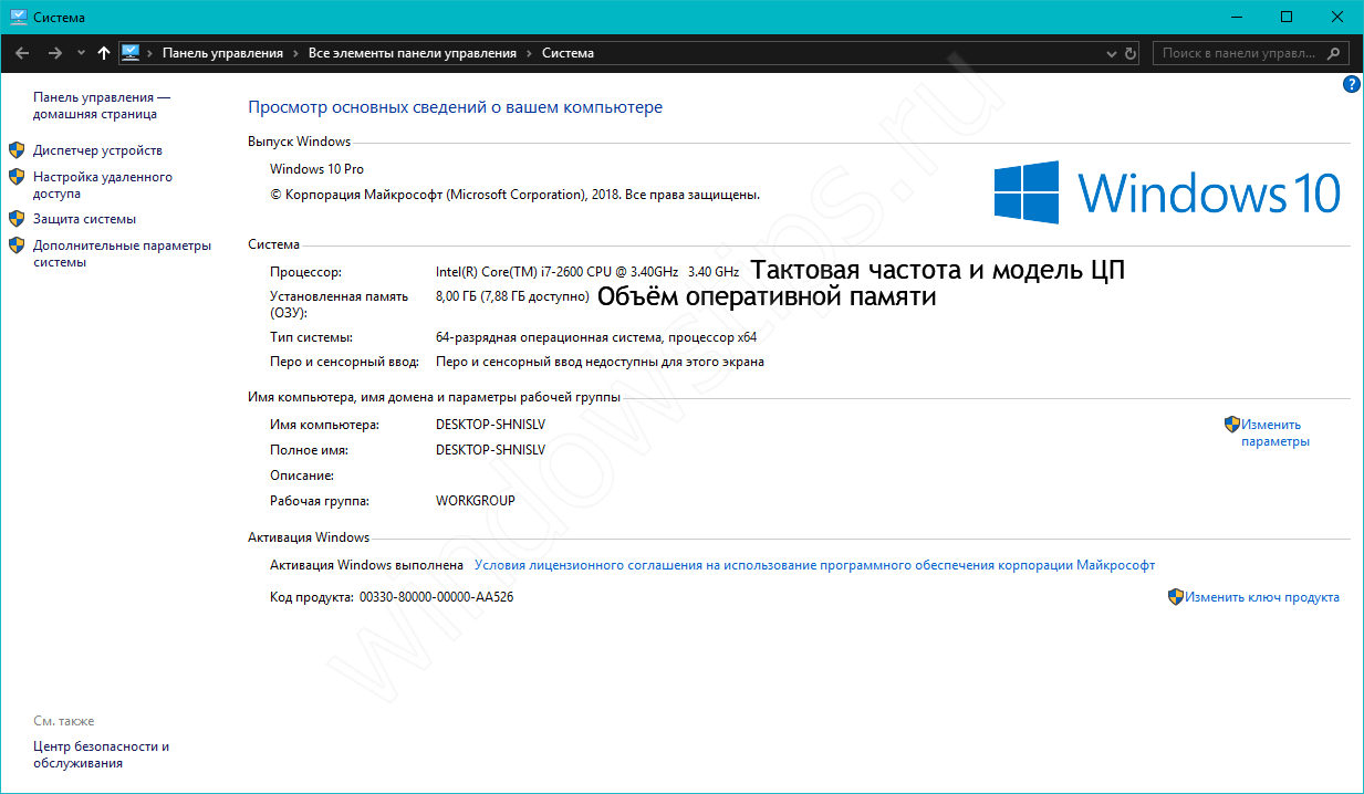 В открывшемся окне можно прочитать такие характеристики, как частота и тип процессора, объем оперативной памяти, версия и разрядность операционной системы.
