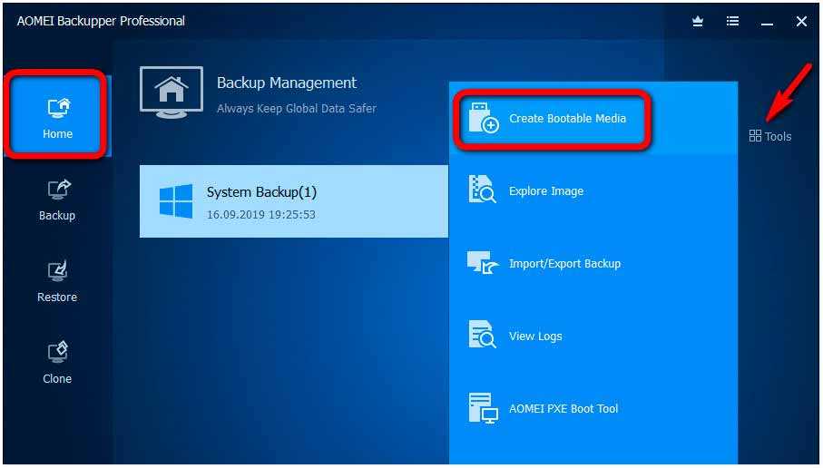 В главном разделе программы раскрываем меню «Tools». Жмём «Create Bootable Media»…
