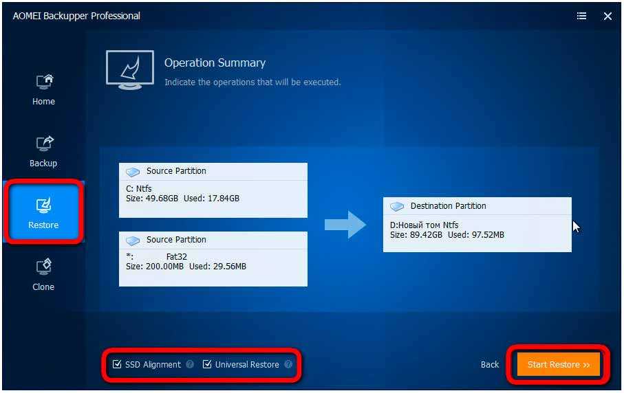 И на этапе сводки операций задействуем опцию выравнивания разделов «SSD Alignment». А потом – опцию упомянутой технологии Universal Restore.