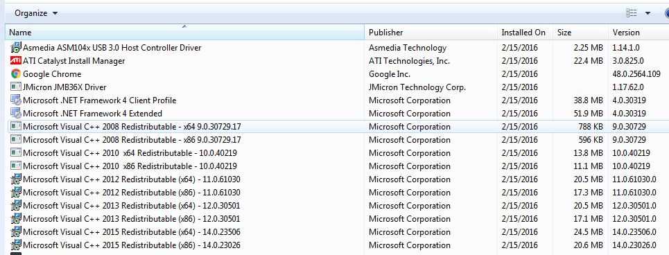 Восстановить распространяемый компонент Visual C ++ для Visual Studio 2015