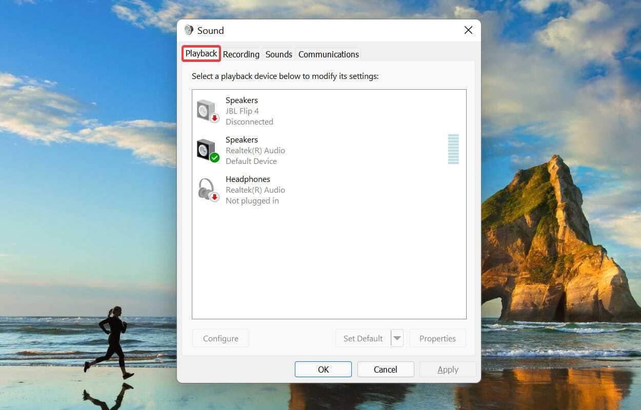 Перейдите на вкладку « Воспроизведение » в окне « Звук» .