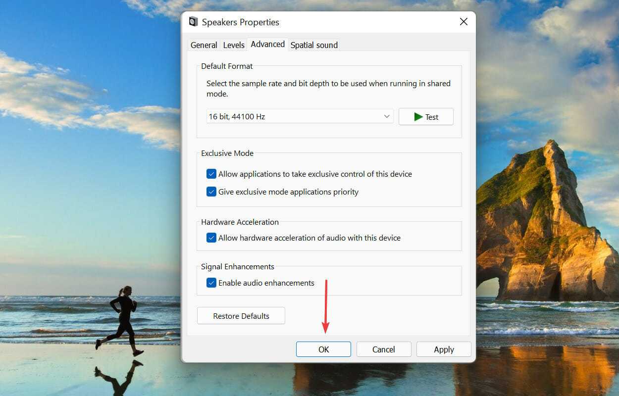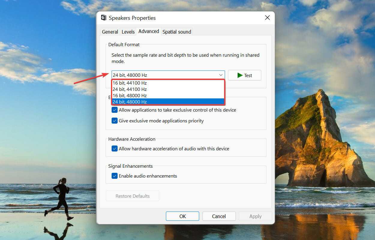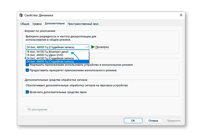 Более высокая частота дискретизации потребляет больше системных ресурсов, что приводит к высокой загрузке ЦП процессом audiodg.exe. Следовательно, снижение частоты дискретизации может сработать как эффективное решение.