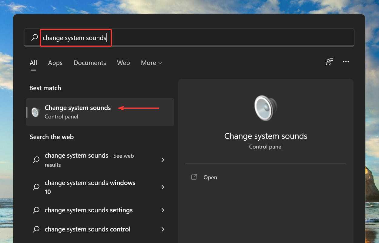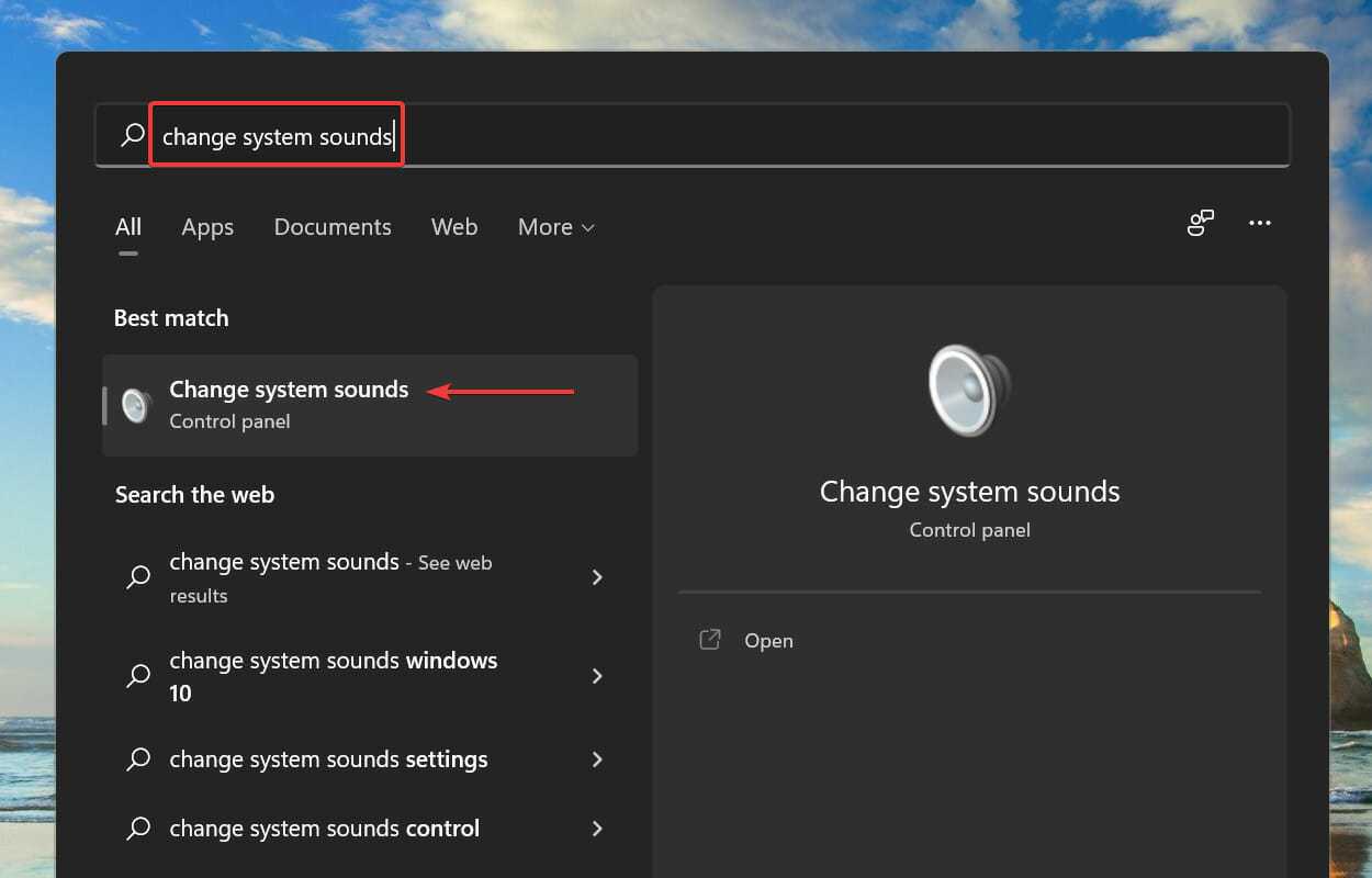 Нажмите Windows+, Sчтобы открыть меню поиска . Введите ” Изменить системные звуки” в текстовое поле вверху и щелкните соответствующий появившийся результат поиска.