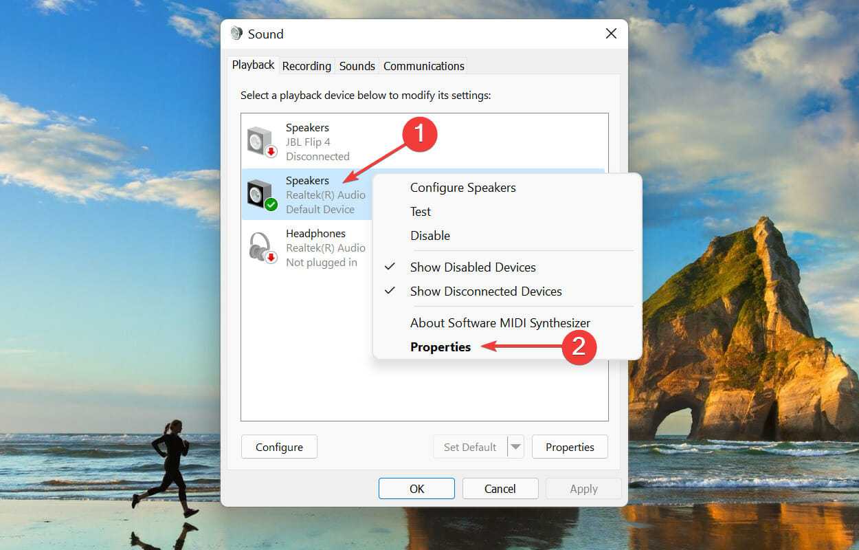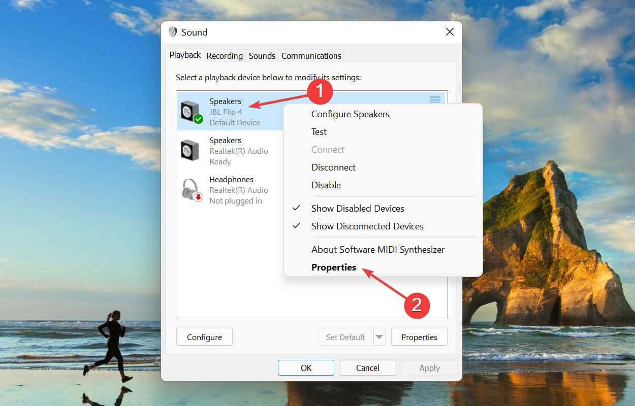 Щелкните правой кнопкой мыши используемый в данный момент динамик и выберите « Свойства» в контекстном меню.