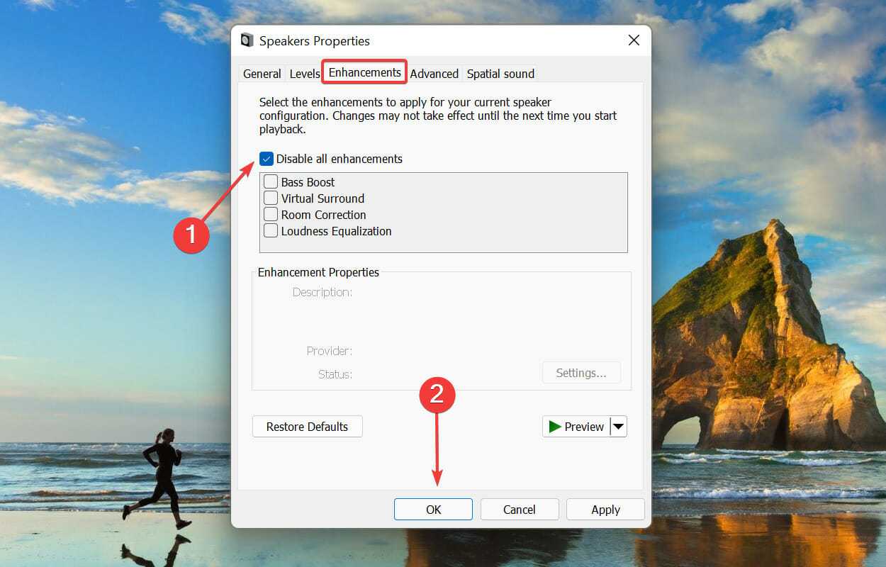 Теперь перейдите на вкладку « Улучшение » в окне « Свойства динамика», установите флажок « Отключить все улучшения» и нажмите « ОК» внизу, чтобы сохранить изменения.