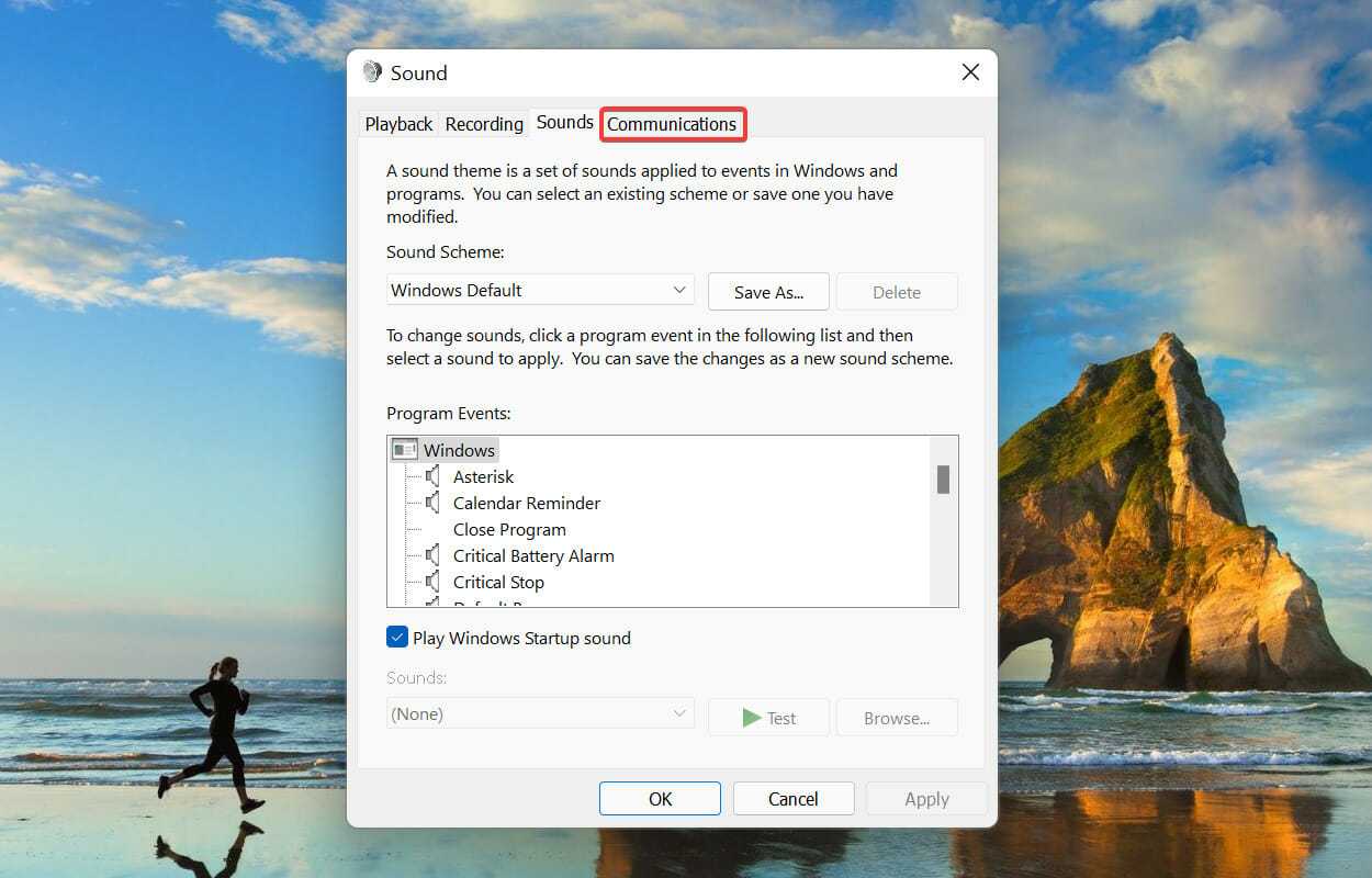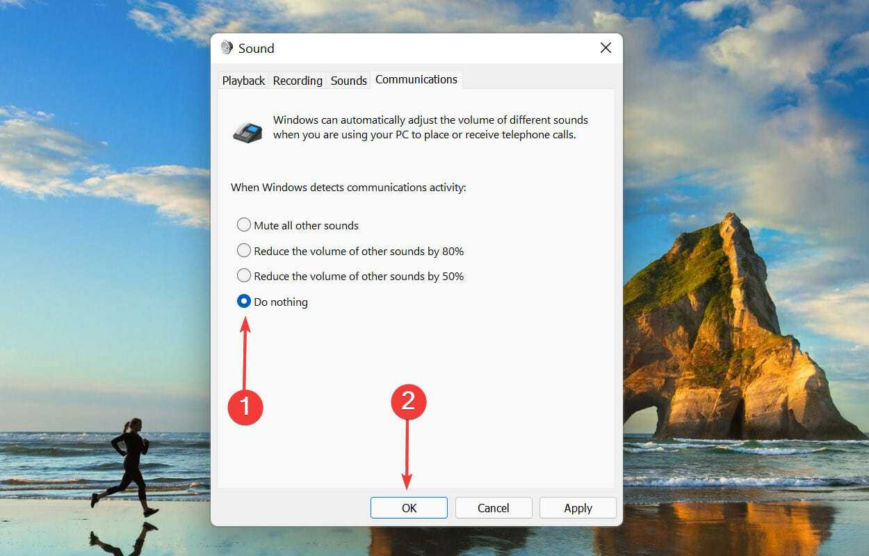 Вам необходимо перенастроить параметры связи во вкладке Звук. Нажмите обратно Win+R и введите mmsys.cpl, чтобы открыть параметры звука. Перейдите во вкладку «Связь» и установите значение на «действие не требуется«, после чего нажмите OK.