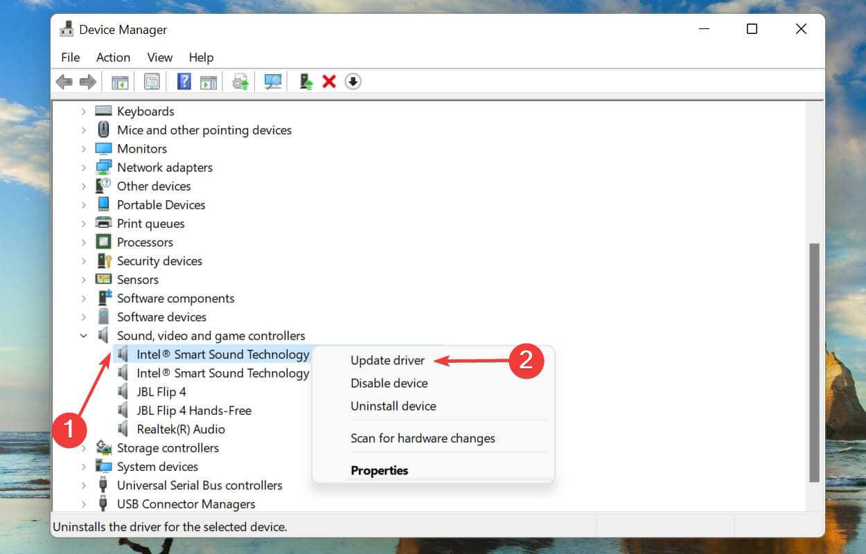 Щелкните звуковую карту правой кнопкой мыши и выберите в контекстном меню « Обновить драйвер» .