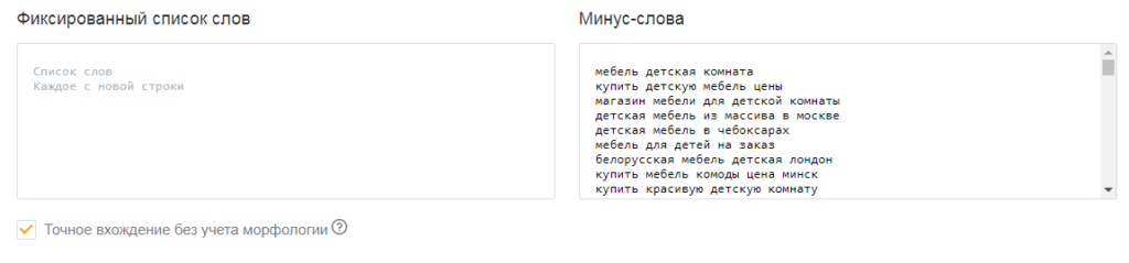 Важно! В блоке профессиональных настроек парсера также есть опция «Точное вхождение без учета морфологии». Если она включена, система не будет собирать указанные ключи в базовом виде, а также с изменением падежа