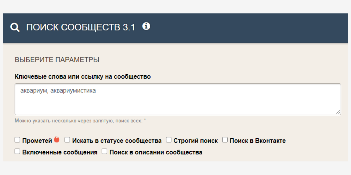 В инструменте «Поиск сообществ 3.1» можно указывать ключевые слова, встречающиеся в названии групп, и задавать параметры участников сообществ.
