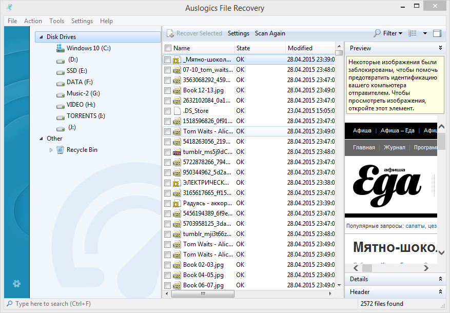 В результате, вы получите список найденных файлов. Далее мы производим файловое восстановление после форматирования в Auslogics File Recovery.