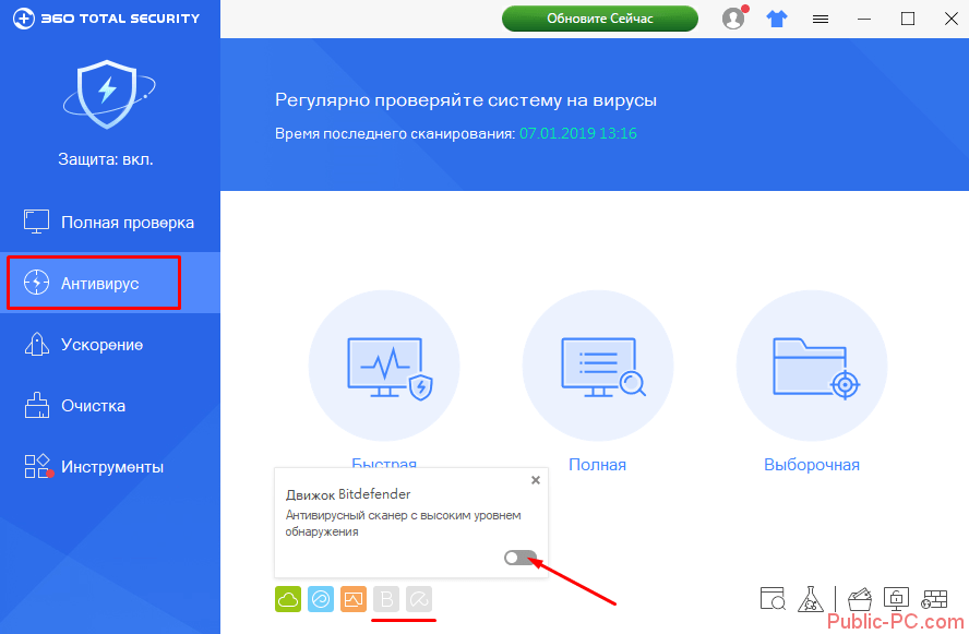 Подключить движки Avira и Bitdefender можно в разделе «Антивирус», кликнув на иконку. Подключив один или оба движка, пользователь существенно повышает защиту компьютера. Но делать это на маломощных ПК не рекомендуется – с повышением уровня защиты уменьшается производительность компьютера. Для подключенных технологий нужно больше ресурсов.