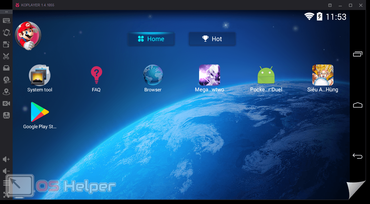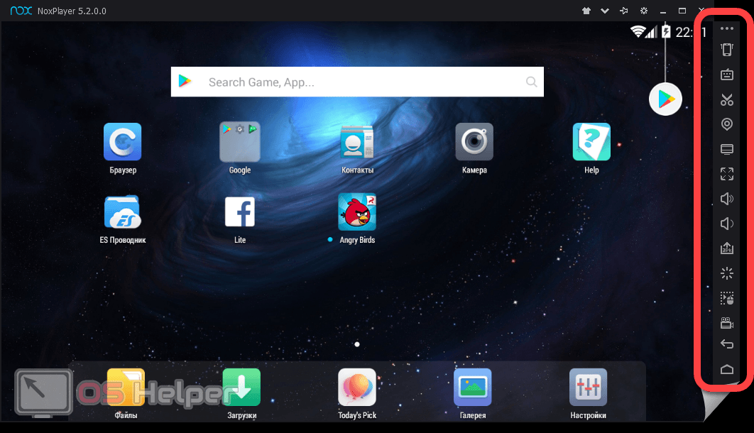 Не снимая галку автозапуска — сразу запускается эмулятор. Внизу вы видите Google Play — магазин приложений и первая иконка — Центр приложений. Там вы сможете увидеть ТОПы игр.