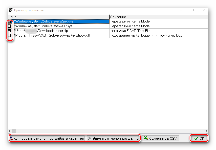 - Появится окно со списком угроз. Выделяем все строки и нажимаем на кнопку «Удалить отмеченные файлы», чтобы избавиться от вирусов.
