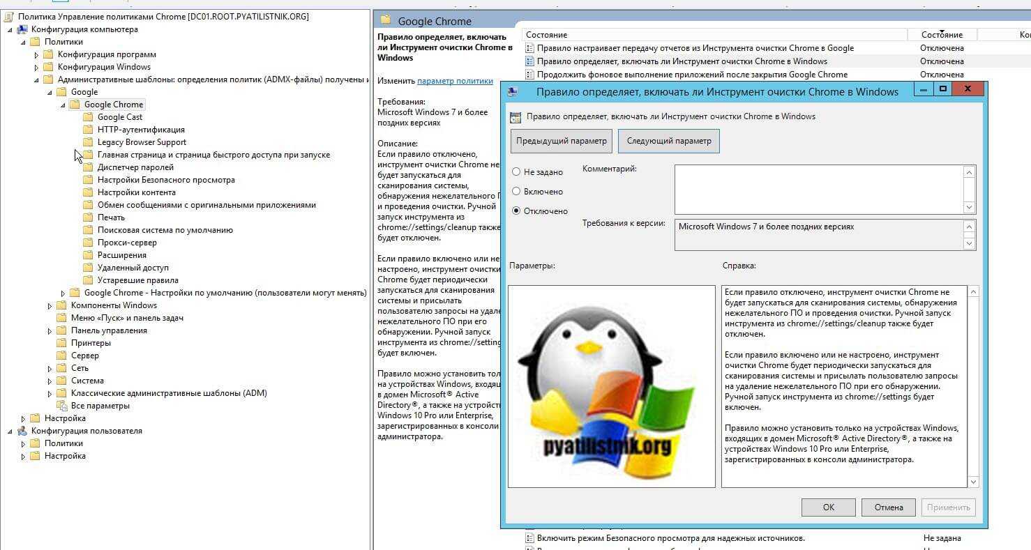 Правило определяет, включать ли Инструмент очистки Chrome в Windows — Если правило отключено, инструмент очистки Chrome не будет запускаться для сканирования системы, обнаружения нежелательного ПО и проведения очистки. Ручной запуск инструмента из chrome://settings/cleanup также будет отключен. Если правило включено или не настроено, инструмент очистки Chrome будет периодически запускаться для сканирования системы и присылать пользователю запросы на удаление нежелательного ПО при его обнаружении. Ручной запуск инструмента из chrome://settings будет включен. Правило можно установить только на устройствах Windows, входящих в домен Microsoft Active Directory, а также на устройствах Windows 10 Pro или Enterprise, зарегистрированных в консоли администратора.