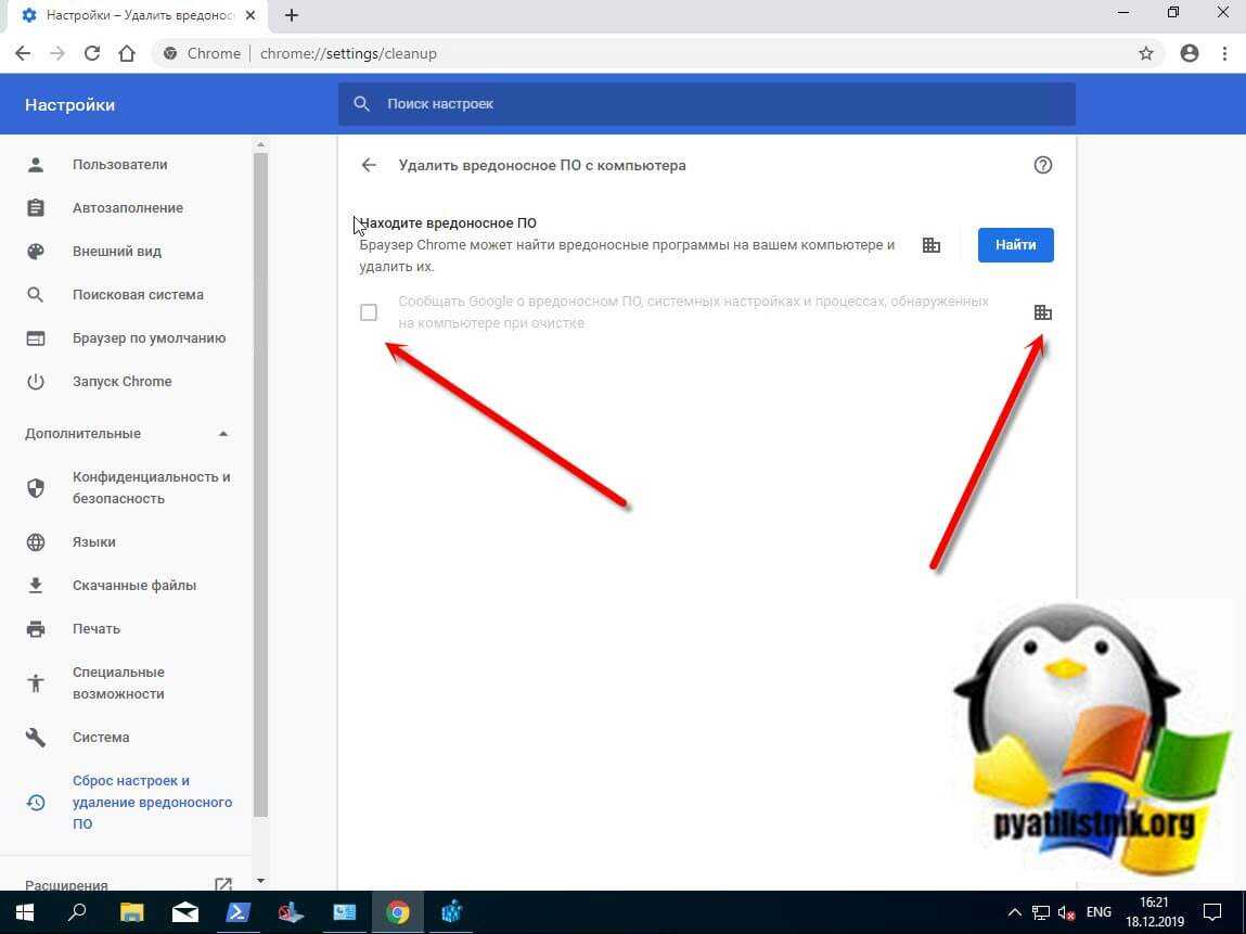 Затем в расположенном ниже блоке «Сброс настроек и удаление вредоносного ПО» нажимаем на пункт «Удалить вредоносное ПО с компьютера» и снимаем галочку с «Сообщать Google о вредоносном ПО, системных настройках и процессах, обнаруженных на компьютере при очистке».