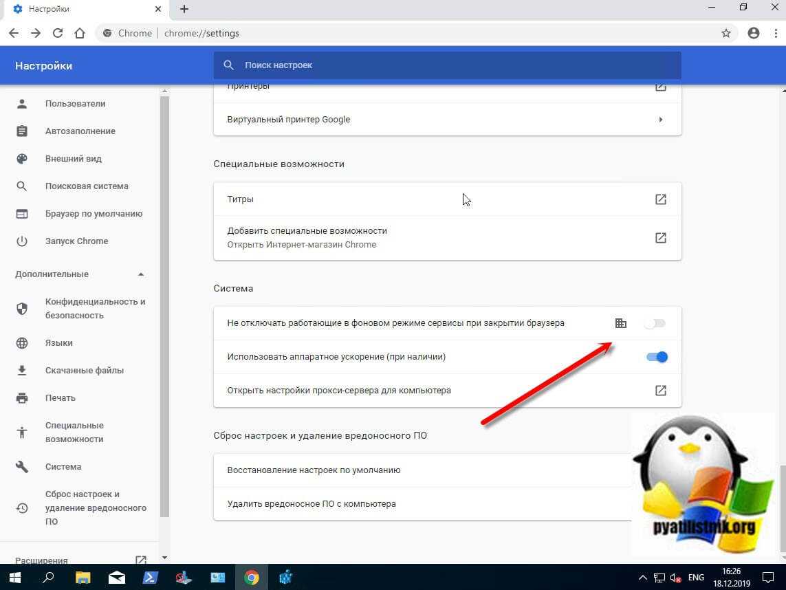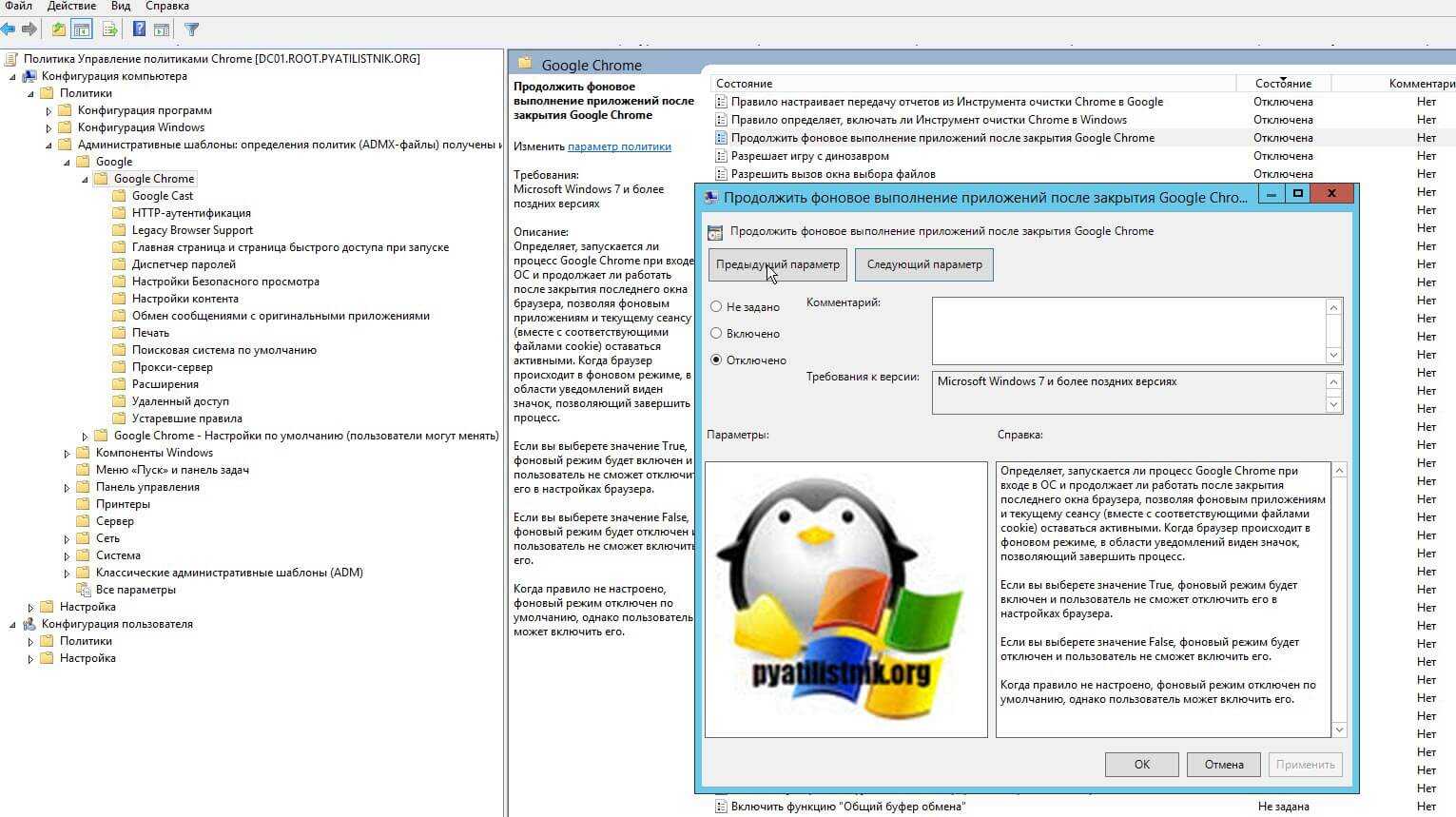 После его выключения в групповой политики у вас будет деактивирована функция «Не отключать работающие в фоновом режиме сервисы при закрытии браузера«.