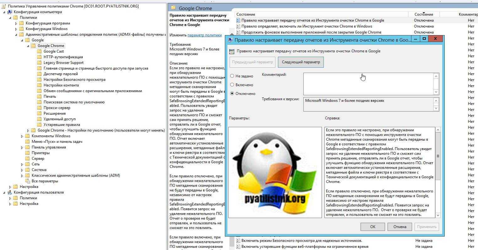 Правило настраивает передачу отчетов из Инструмента очистки Chrome в Google — Если это правило не настроено, при обнаружении нежелательного ПО с помощью инструмента очистки Chrome метаданные сканирования могут быть переданы в Google в соответствии с правилом SafeBrowsingExtendedReportingEnabled. Пользователь увидит запрос на удаление нежелательного ПО и сможет сам принять решение, отправлять ли в Google отчет, чтобы улучшить функцию обнаружения нежелательного ПО. Отчет включает автоматически установленные расширения, метаданные файла и ключи реестра в соответствии с Технической документацией о конфиденциальности в Google Chrome. Если правило отключено, при обнаружении нежелательного ПО метаданные сканирования не будут переданы в Google, независимо от настроек правила SafeBrowsingExtendedReportingEnabled.