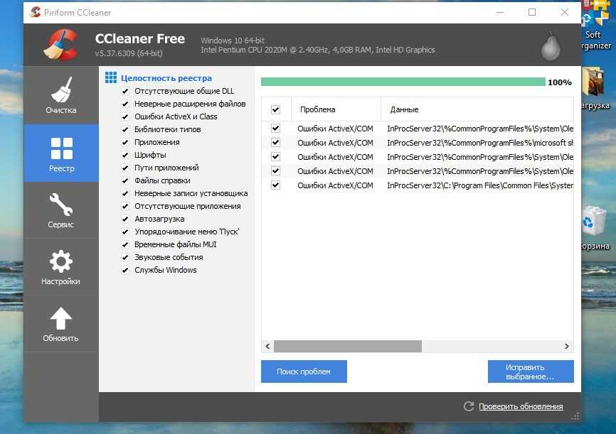 Вполне вероятно, что некорректная работа COM Surrogate связана с вирусным поражением ОС. Запустите антивирус и выберите глубокую проверку. Встроенного в Виндовс «Защитника системы» здесь будет недостаточно. Лучше скачать полную или портативную версию какой-нибудь серьёзной программы, например, «Доктор Веб», «Антивирус Касперского», «Аваст» и т. п. Если ничто не помогло, можно воспользоваться утилитой CCleaner, чтобы проверить, не допустила ли какая-нибудь программа ошибку при регистрации своих элементов в COM Surrogate. Для этого откройте главное меню приложения и раздел «Реестр». Слева отметьте галочкой «Ошибки ActiveX и Class» и начните анализировать. Высветится список проблемных компонентов, выделите все и нажмите «Исправить».