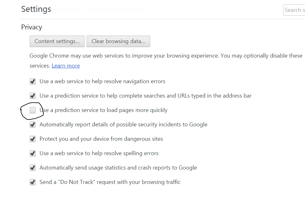 - Here you will see an option of ‘Use Prediction Services to Load the Pages more Quickly’