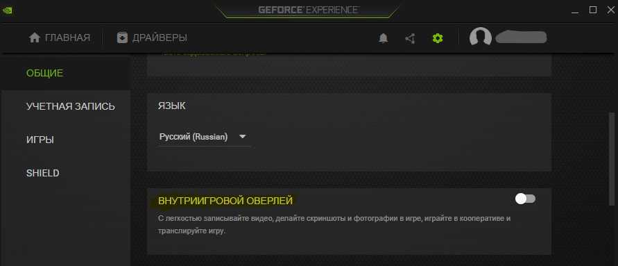Запустите приложение GeForce Experience в качестве администратора, нажмите параметры (иконка шестеренки) и перейдите во вкладку «Общие«. Найдите «внутри-игровой оверлей» и отключите его. Может называться как Nvidia ShowPlay или Nvidia Share.