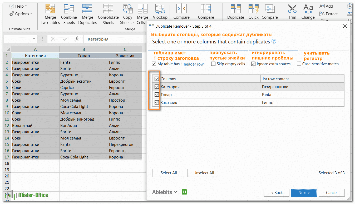 - Выберите столбцы для проверки дубликатов (в этом примере это все 3 столбца: категория, продукт и клиент).