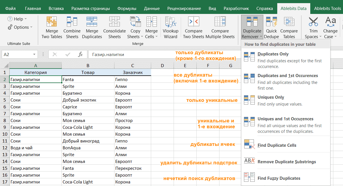 Если вам нужно больше возможностей для работы с дубликатами и уникальными значениями, используйте Duplicate Remover, который может находить дубликаты с первыми вхождениями или без них, а также уникальные значения. Подробные инструкции приведены ниже.