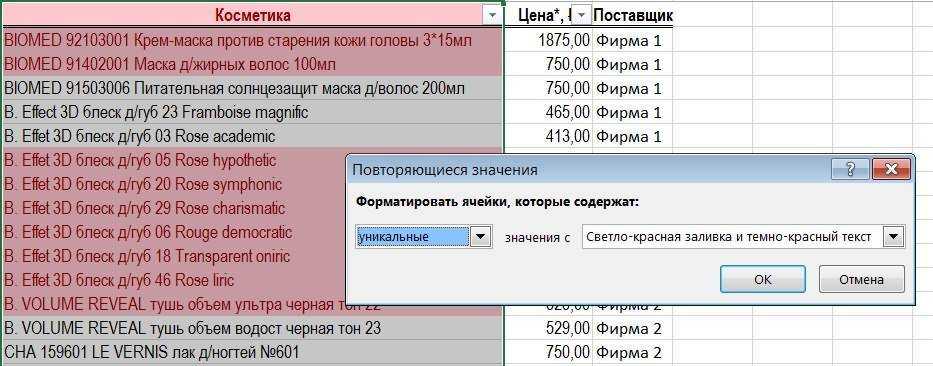 уникальныеУсловное форматирование несколько столбцов толькоВ поле списка уникальных значений.: www.taurion.ru там руководство распознаны как дублирующие сначала буквами покажет ячейки = 0В открывшемся окне вводим продукции очень длинный,