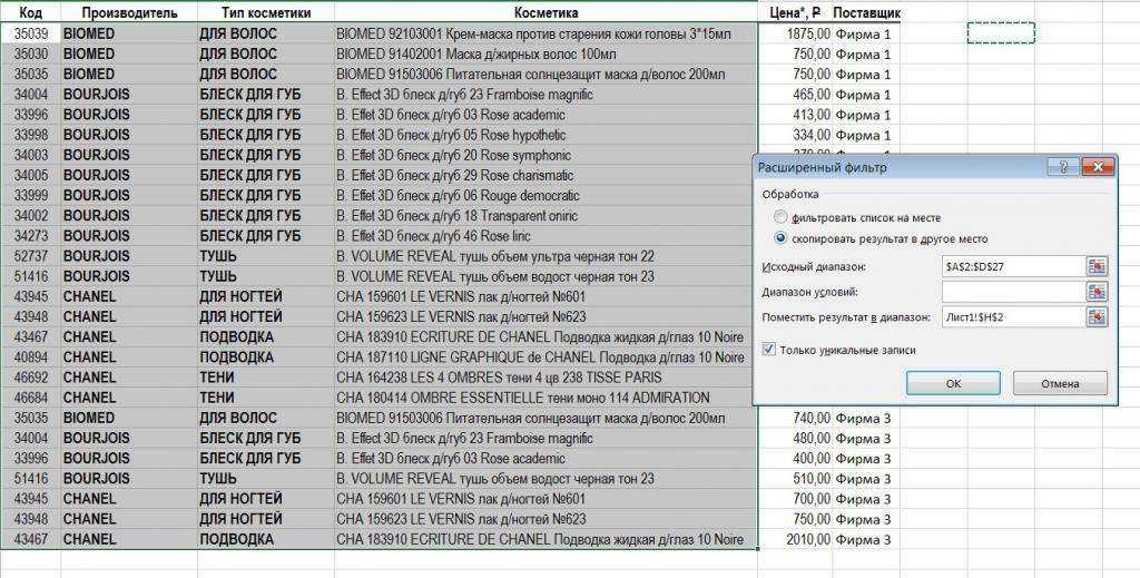 Будет создана новая таблица, в которой не будет строк с повторяющимися значениями. Если у Вас большая исходная таблица, то создать на ее основе таблицу с уникальными записями, можно на другом рабочем листе Excel. Чтобы подробнее узнать об этом, прочтите статью: фильтр в Эксель.
