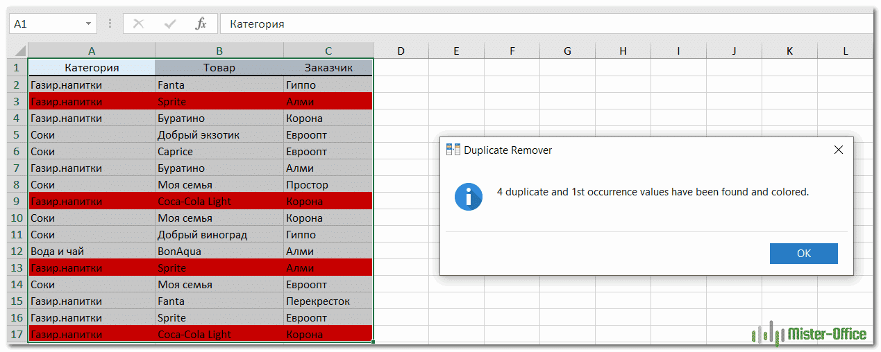 Принципиально! Этом способ не так всепригоден, как описанные выше, потому что выделяет все ячейки с схожими значениями, а не только лишь те, для которых совпадает вся строчка полностью. Это видно на прошлом снимке экрана, когда нужные задвоения по заглавиям регионов были выделены, но вкупе с ними отмечены и все ячейки с категориями регионов, поэтому что значения этих категорий повторяются.