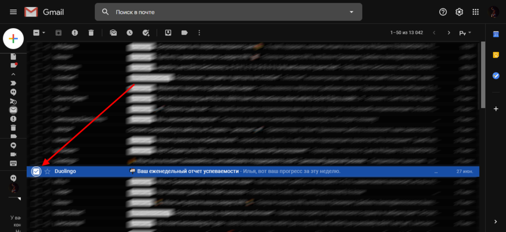 - Найти письмо как это описано выше. Отметить сообщение с помощью флажка слева.