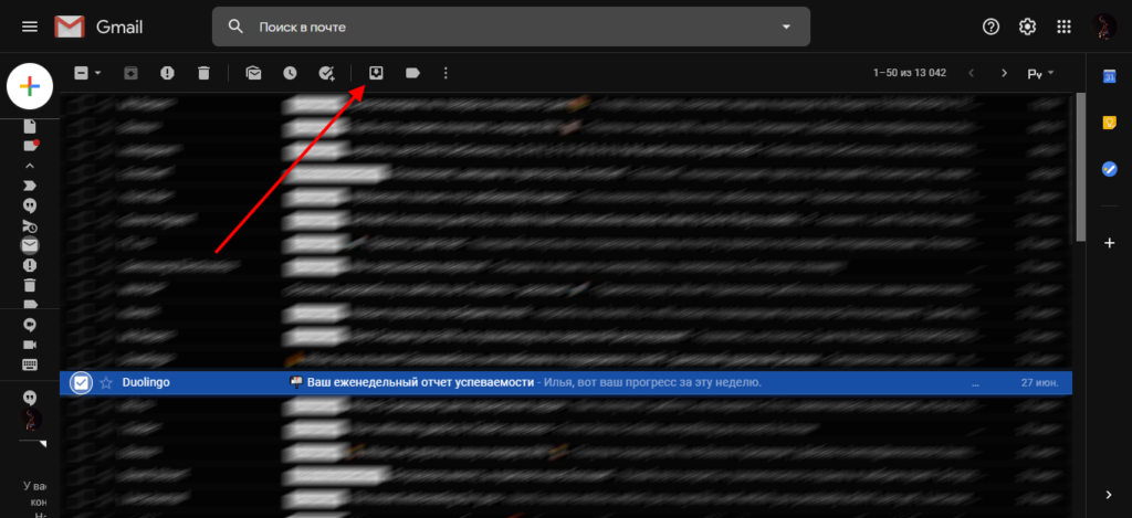 Архивирование письма в Gmail осуществляется при помощи выделения письма и нажатия на кнопку «Архивировать».
