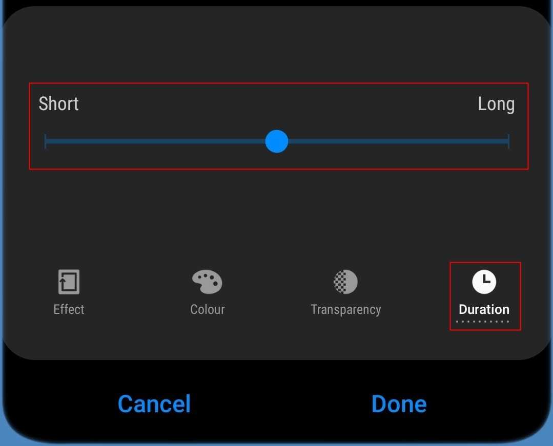 Чтобы изменить продолжительность эффекта краевого освещения, нажмите на Продолжительность на нижней панели, и вы сможете выбрать из Короткие, средние и длинные варианты продолжительности. Нажмите на Сделанный когда доволен.