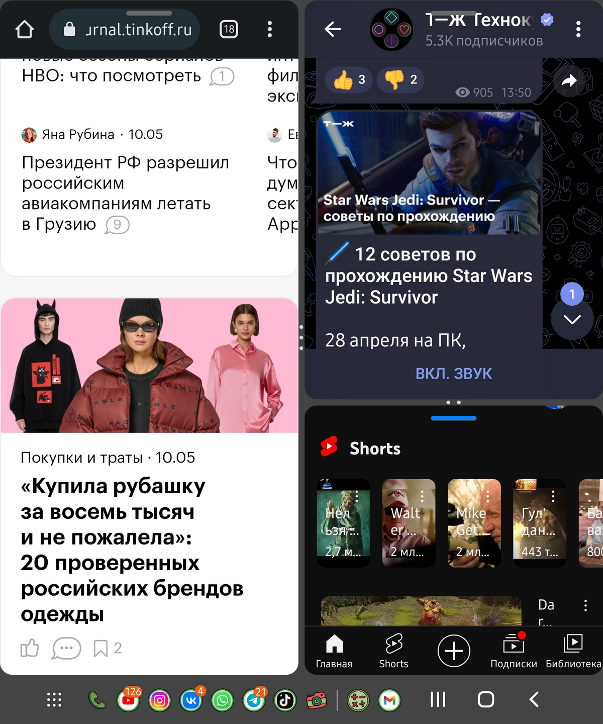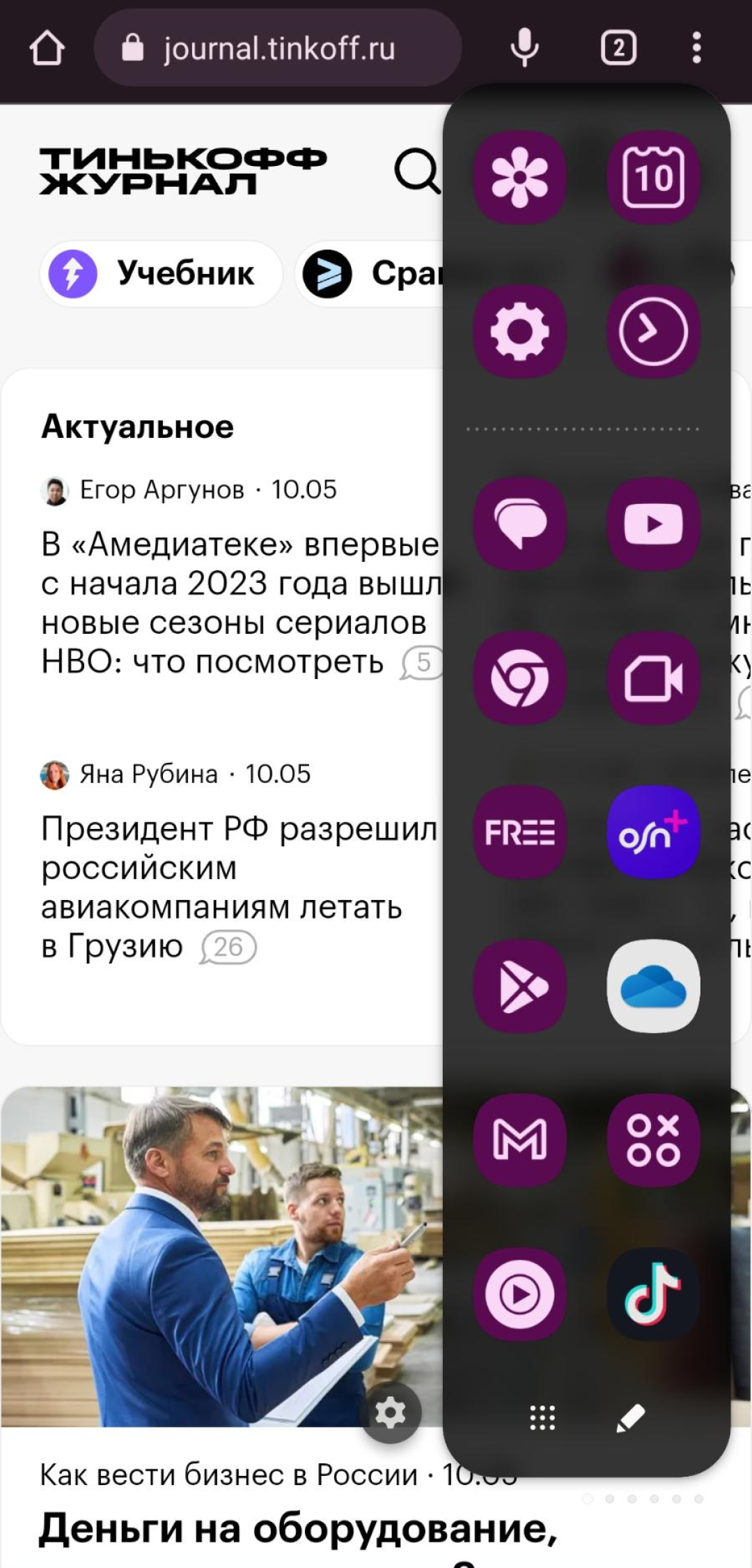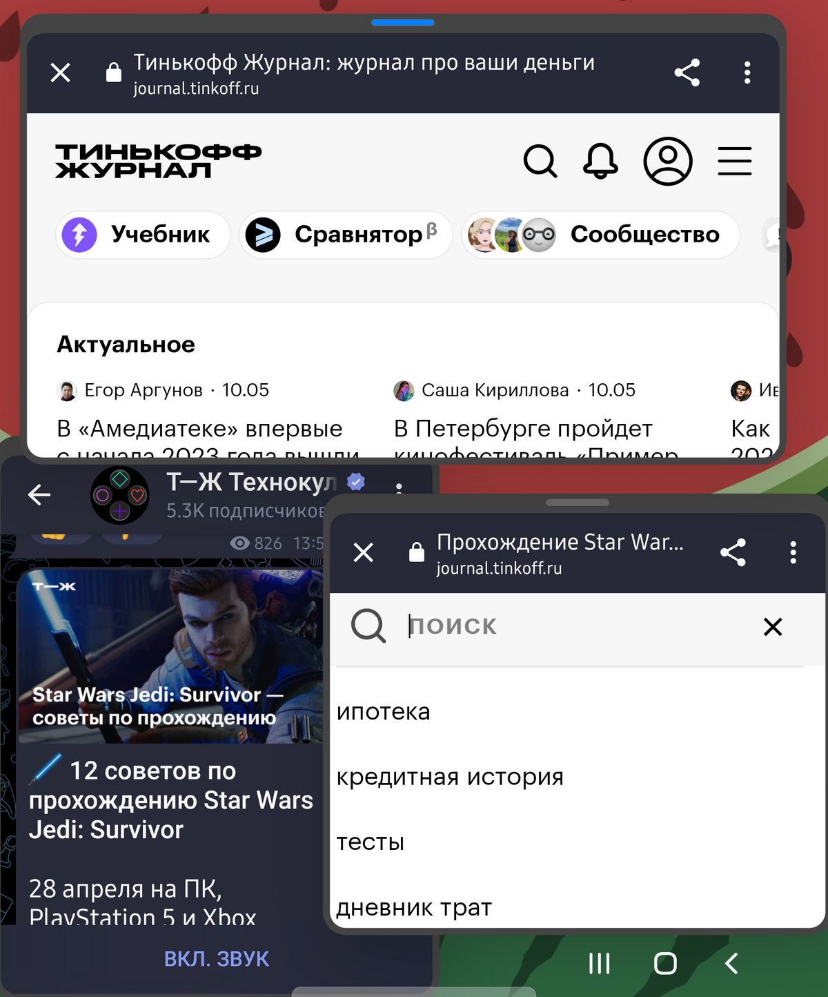 Оконный режим на экране Galaxy Fold3 — браузер плохо подстраивается под окно, а вот мессенджеры и «Ютуб» использовать удобно