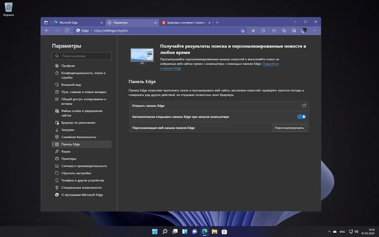«Панель Edge» запускается по умолчанию, но это можно изменить с помощью настроек на странице edge://settings/edgeBar . Все параметры персонализации настраиваются на веб-сайте Microsoft Start, а не в Edge.