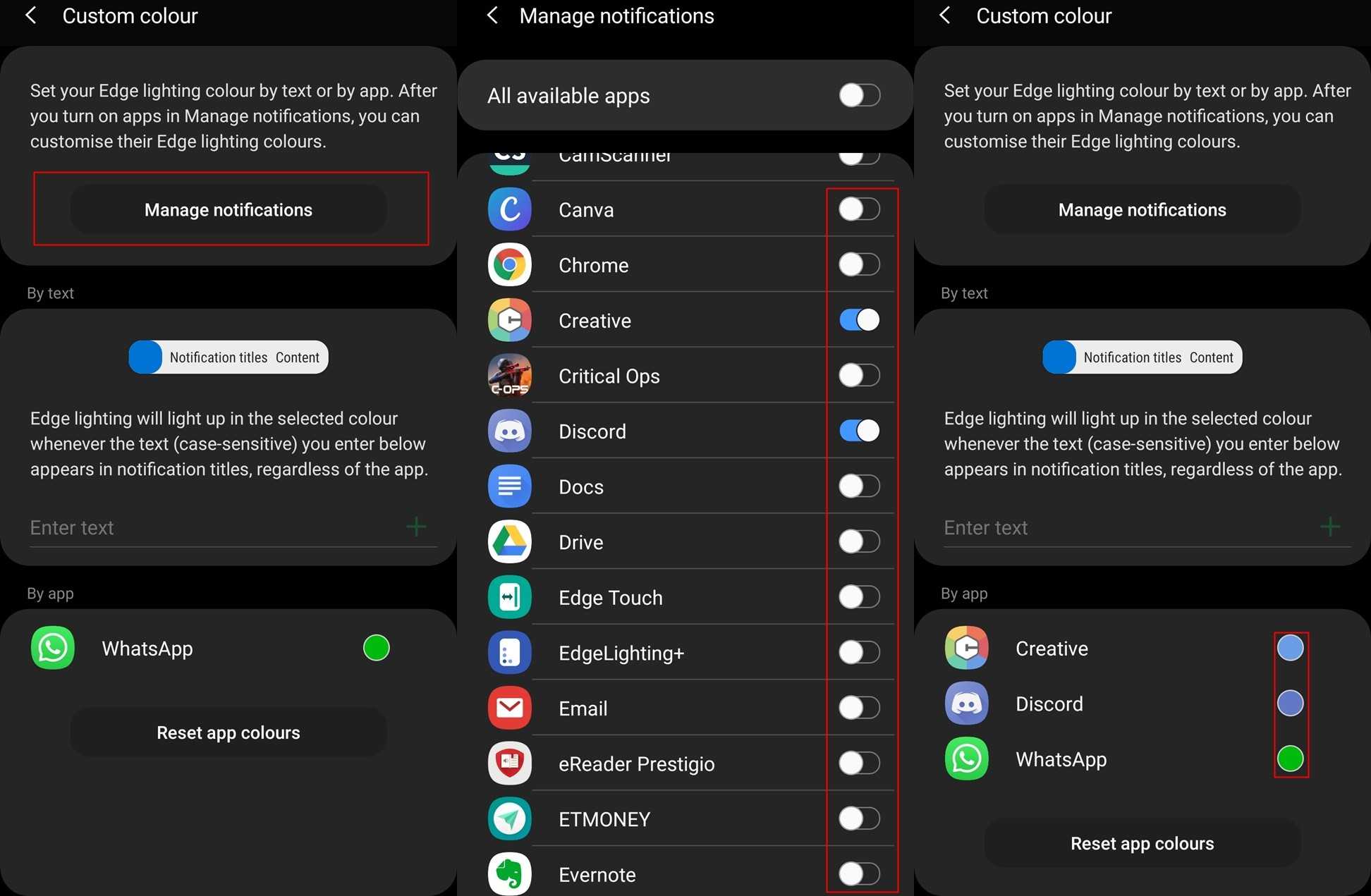 - Выберите приложения, для которых вы хотите отображать собственный цвет с помощью эффекта Edge Lighting.