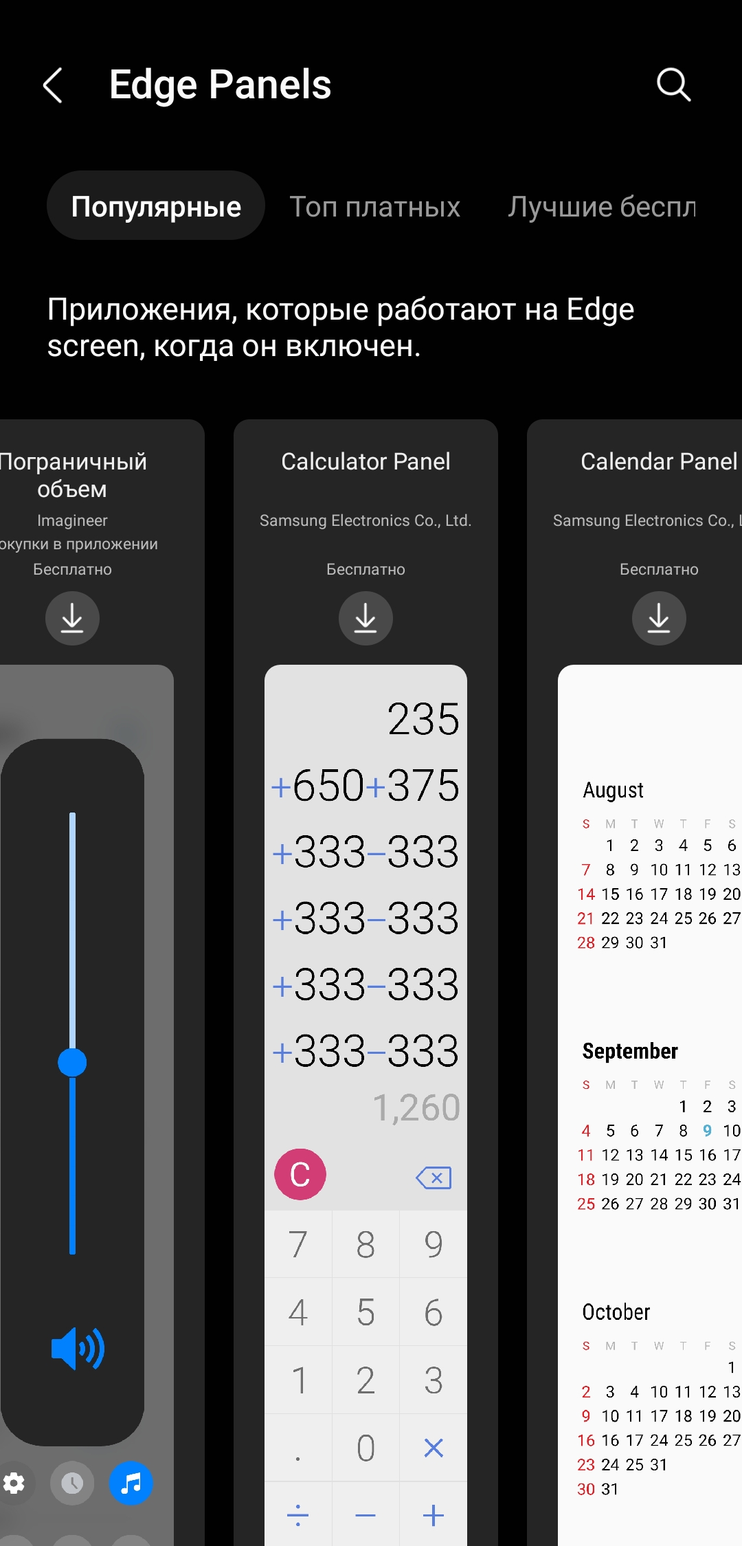 У Samsung есть Galaxy Store — собственный магазин приложений. К восьми основным панелям из него можно загрузить более 50 дополнительных, некоторые из них платные. Вот какие панели бывают: