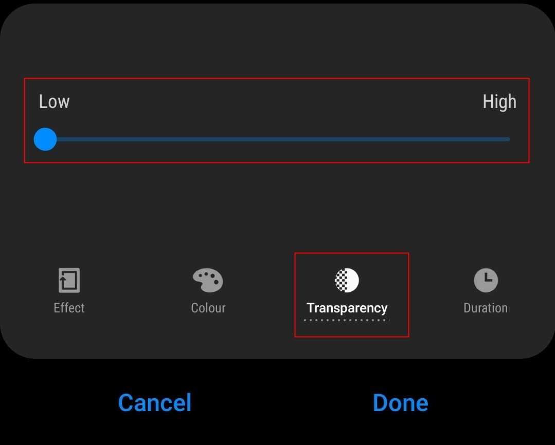 Нажмите на Прозрачность на нижней панели и используйте слайдер для настройки прозрачности эффекта краевого освещения.
