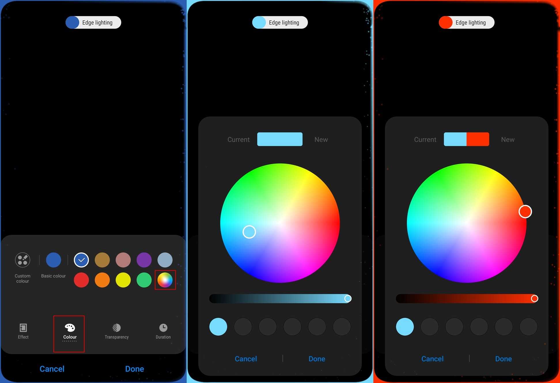 Вы можете изменить цвет эффекта краевого освещения, просто нажав на Цвет опция присутствует в нижней панели Боковое освещение + заявление.