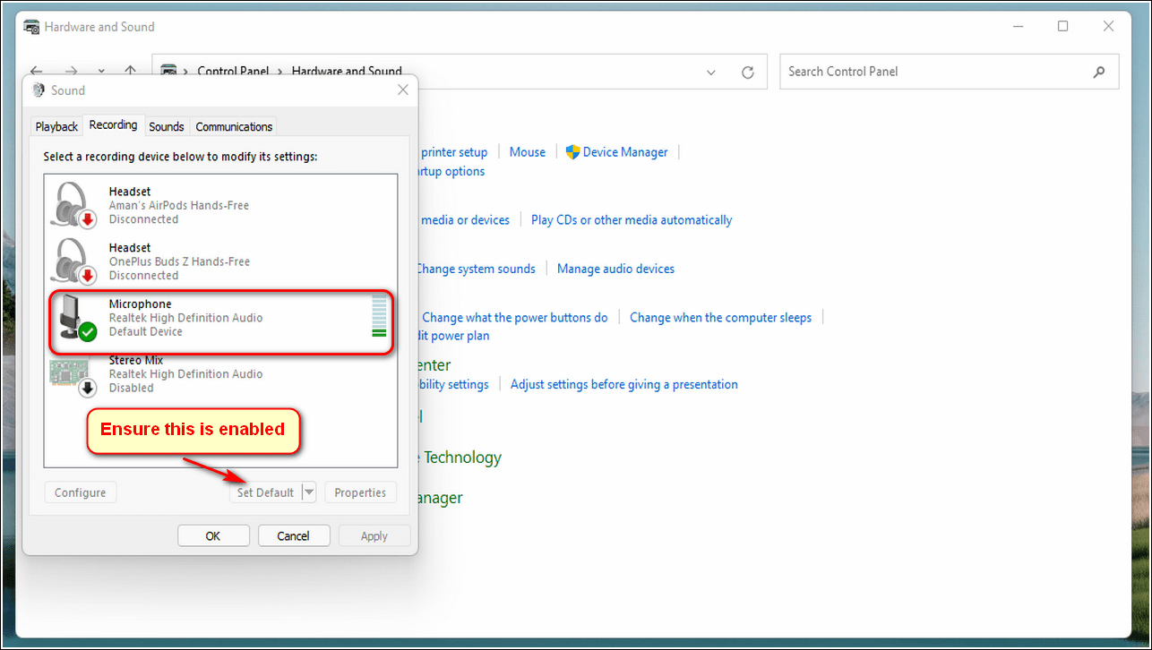 - Выберите свой микрофон и нажмите кнопку «Установить по умолчанию».