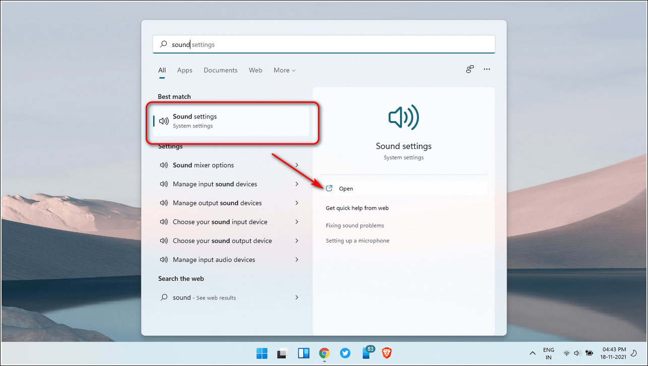 - Нажмите кнопку Windows, найдите Настройки звука и откройте его.