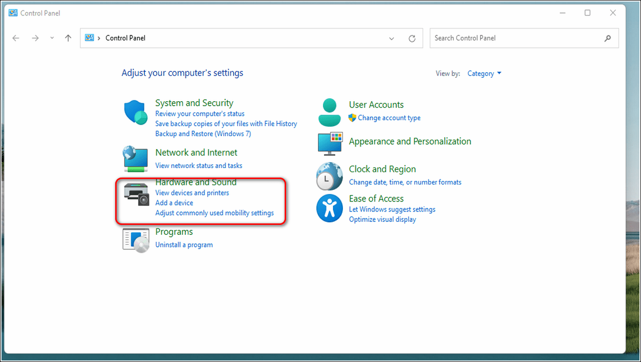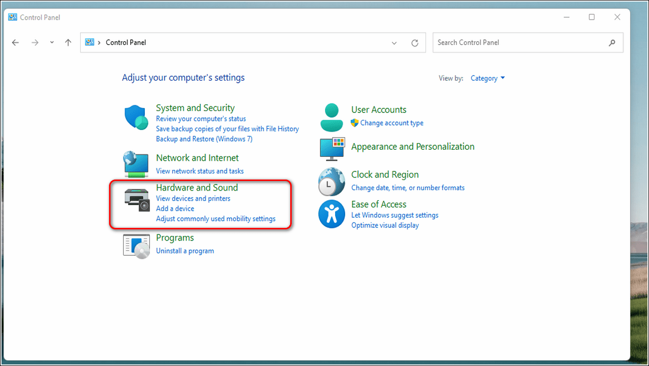 Щелкните Оборудование и звук.