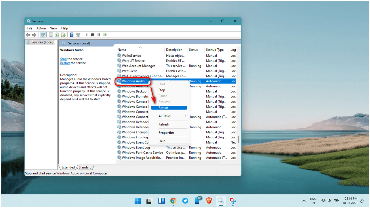 - Щелкните правой кнопкой мыши Windows Audio и нажмите «Перезагрузить», чтобы перезагрузить Windows Audio Services.