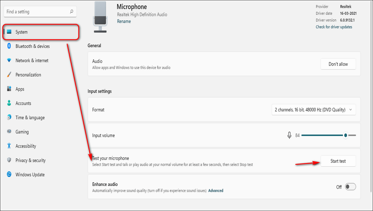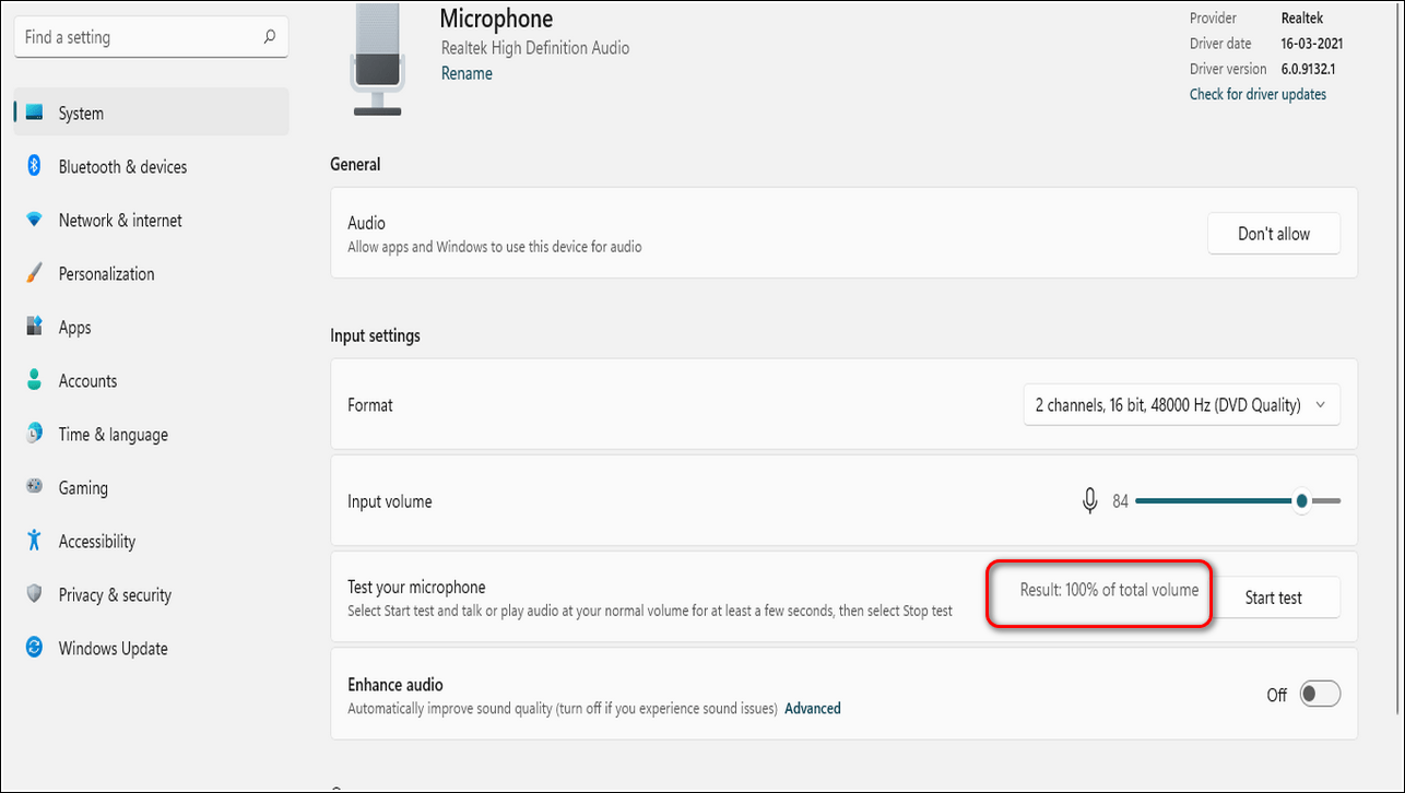 - Нажмите Start Test, чтобы проверить микрофон.