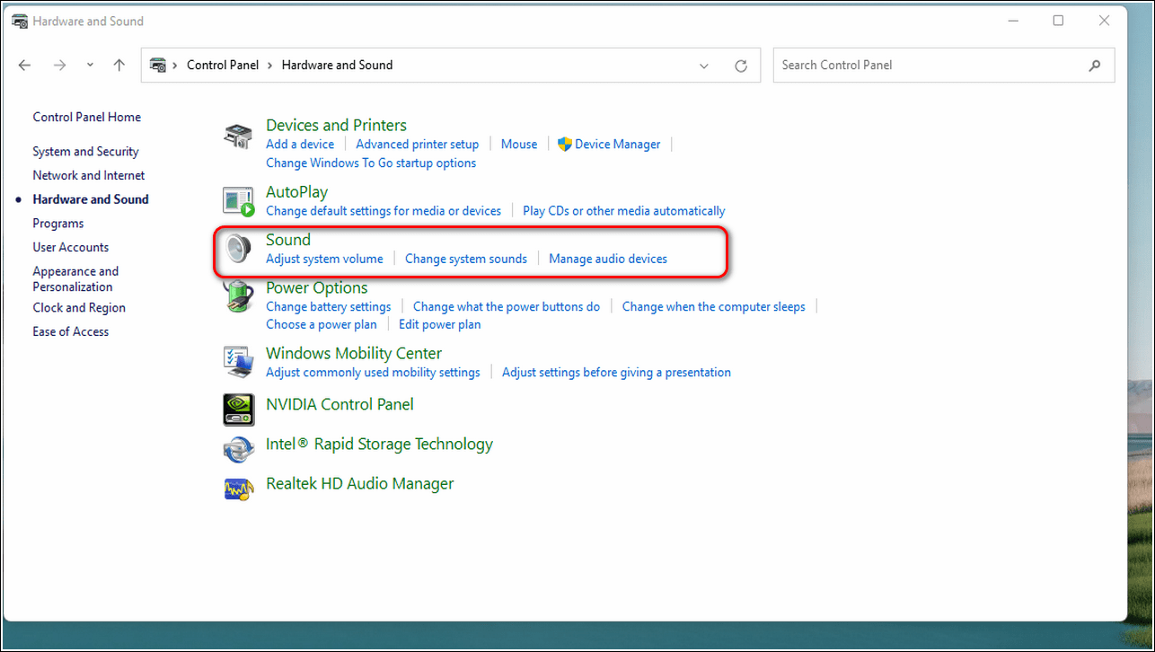 - Щелкните Оборудование и звук и откройте параметр Звук.