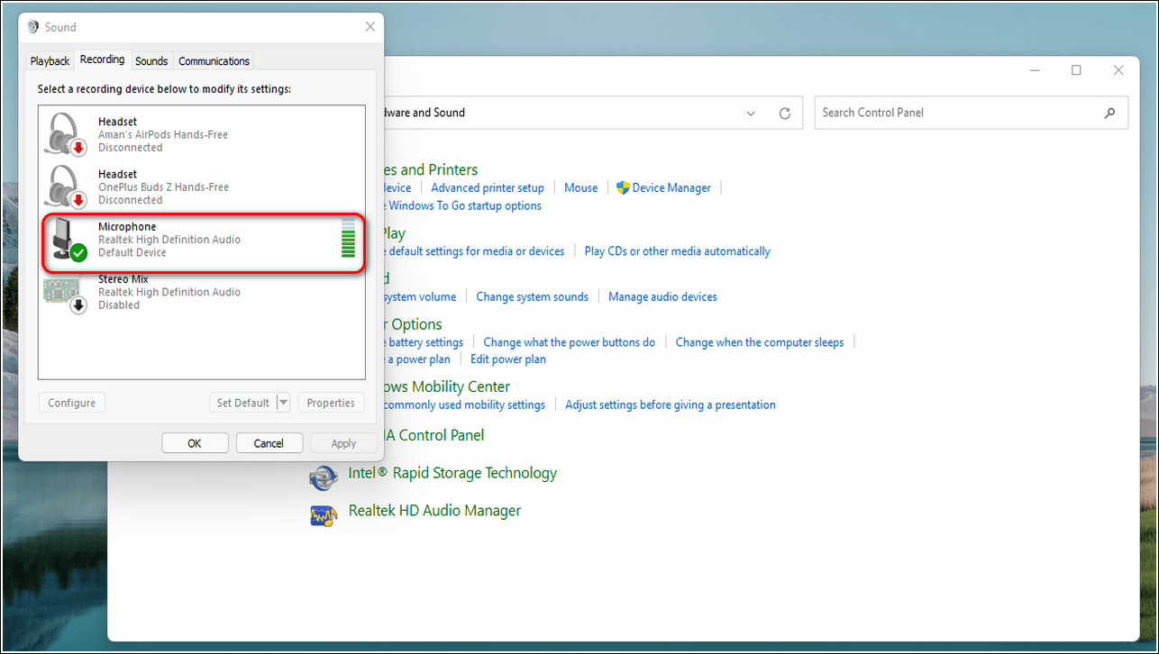 Сделайте настройки по умолчанию для вашего микрофона