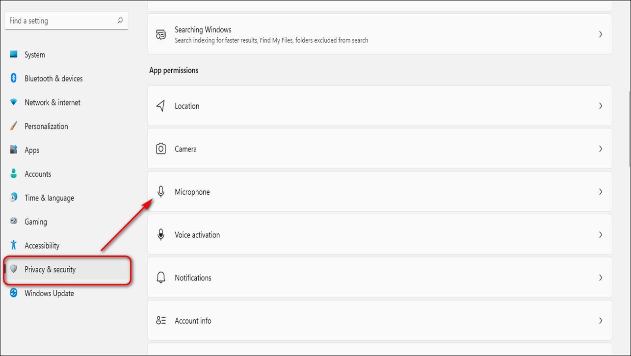 - Выберите «Микрофон» в разделе «Разрешения приложения» в списке слева.
