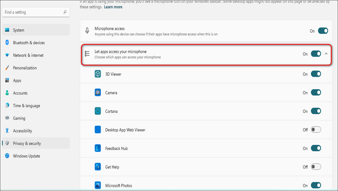 Вы также можете переключить Разрешить приложениям доступ к вашему микрофону, чтобы запретить доступ к микрофону для всех приложений.