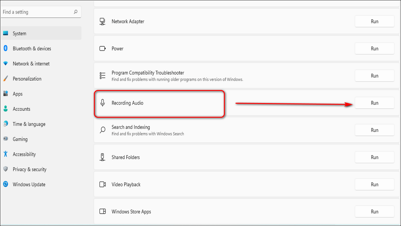- Прокрутите вниз, чтобы найти «Запись звука», и нажмите «Выполнить», чтобы запустить средство устранения неполадок.