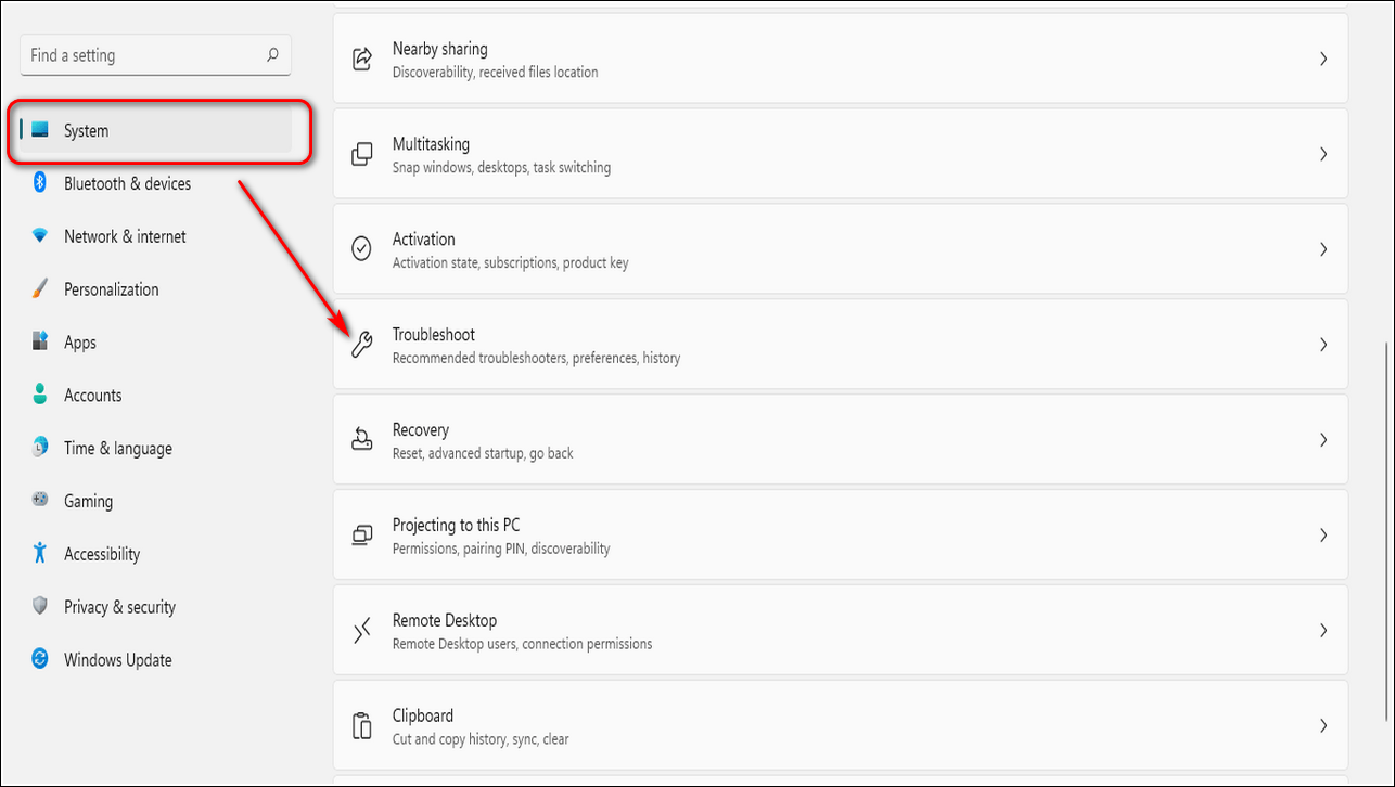 - На левой панели нажмите Система и прокрутите вниз, чтобы найти Устранение неполадок.