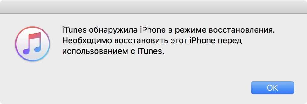 Только программа iTunes на Windows ПК или Finder на Mac с macOS Catalina просигнализируют специальным сообщением, о том, что подключенный гаджет находится в режиме восстановления.